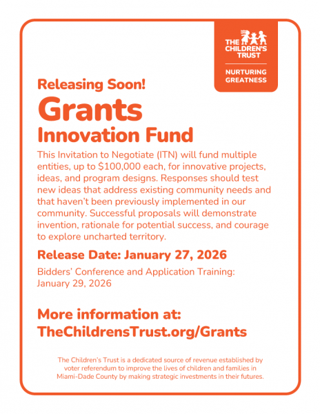 Apply for The Children's Trust's new Grants Innovation Fund opportunity, will fund multiple entities, for up to $100,000 each, for innovative ideas and program designs that address existing community needs and have not previously been implemented!