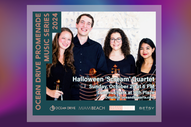 Join us on Ocean Drive on October 27th for a performance from Biscayne String Quartet as part of the Ocean Drive Promenade Music Series, a free, weekly concert series presented by the Ocean Drive Association. Pack a picnic blanket or lawn chair to stake out your seat on the lawn. Showtime is at 6:00 PM.