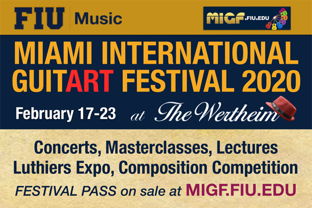 The 2020 Miami International GuitART Festival presents a lecture on “Arab-Andalusian music in the Iberian Peninsula” by French guitarist and composer of Portuguese origin Arthur Dente. The festival continues until February 23rd with daily concerts, masterclasses, lectures, and Luthiers Expo. More info and festival pass available at migf.fiu.edu