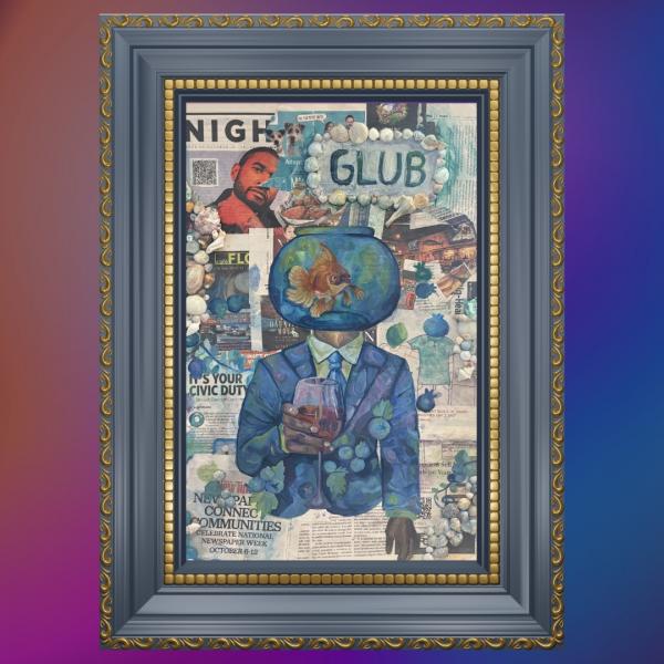 Pictured: Glub (2024) by Design and Architecture Senior High sophomore Falon Fraga uses shells, newspaper, and paint to comment on privilege and power, offering a powerful commentary on societal structures and authority.